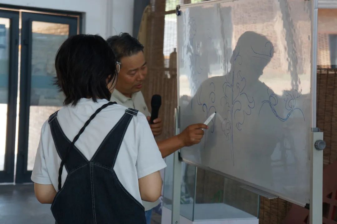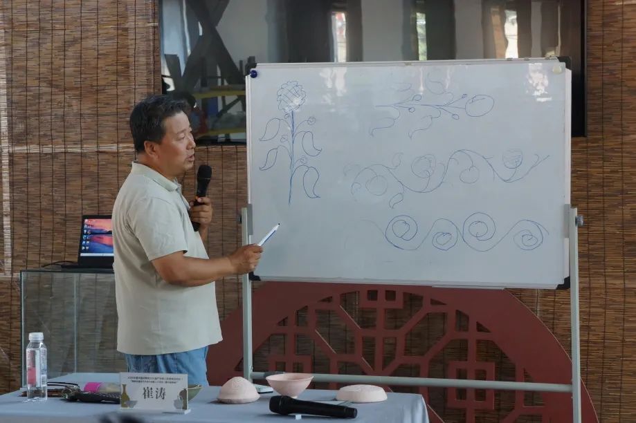 此外,课程现场崔涛老师以折枝牡丹为范例,在白板上细致绘制纹样,拆解从自然生长形态到装饰图案的转化逻辑:如何提炼花瓣的舒展弧度、如何通过线条疏密强化韵律感,让学员清晰掌握传统纹样的设计方法论。面对学员们关于工艺难点、纹样创新的提问,他结合自身数十年实践经验耐心答疑,从刻刀角度到釉料配比,深入浅出的讲解让抽象技艺变得可知可感。