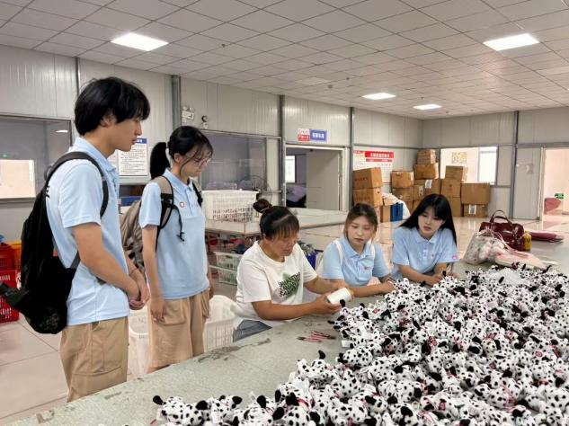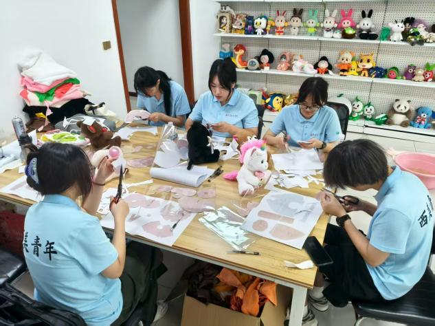 深化“产学研”协同,是此次实践的重要目标。在安康爱多宝动漫文化公司,团队师生系统观摩毛绒玩具设计、裁剪、缝纫、填充全流程,并在师傅“手把手”指导下沉浸式体验制作,领悟“稳、准、恰到好处”的工匠精神,最终手捧作品满载收获。 团队成员通过与工人们的深入交流,累计采访了20余人,收获了许多感人故事。研发部组长(工龄6年)称“家门口上班减少了留守儿童,家庭条件与教育条件都向好变化了”,手工车间组长(工龄5年)笑言是这里是“妈妈俱乐部”。真切感受企业带来的巨变:提供就业、带动脱贫、产品远销欧美、促进家庭团聚与教育改善。