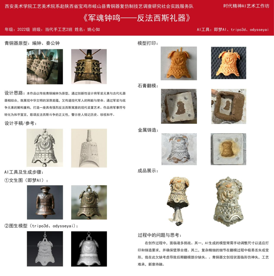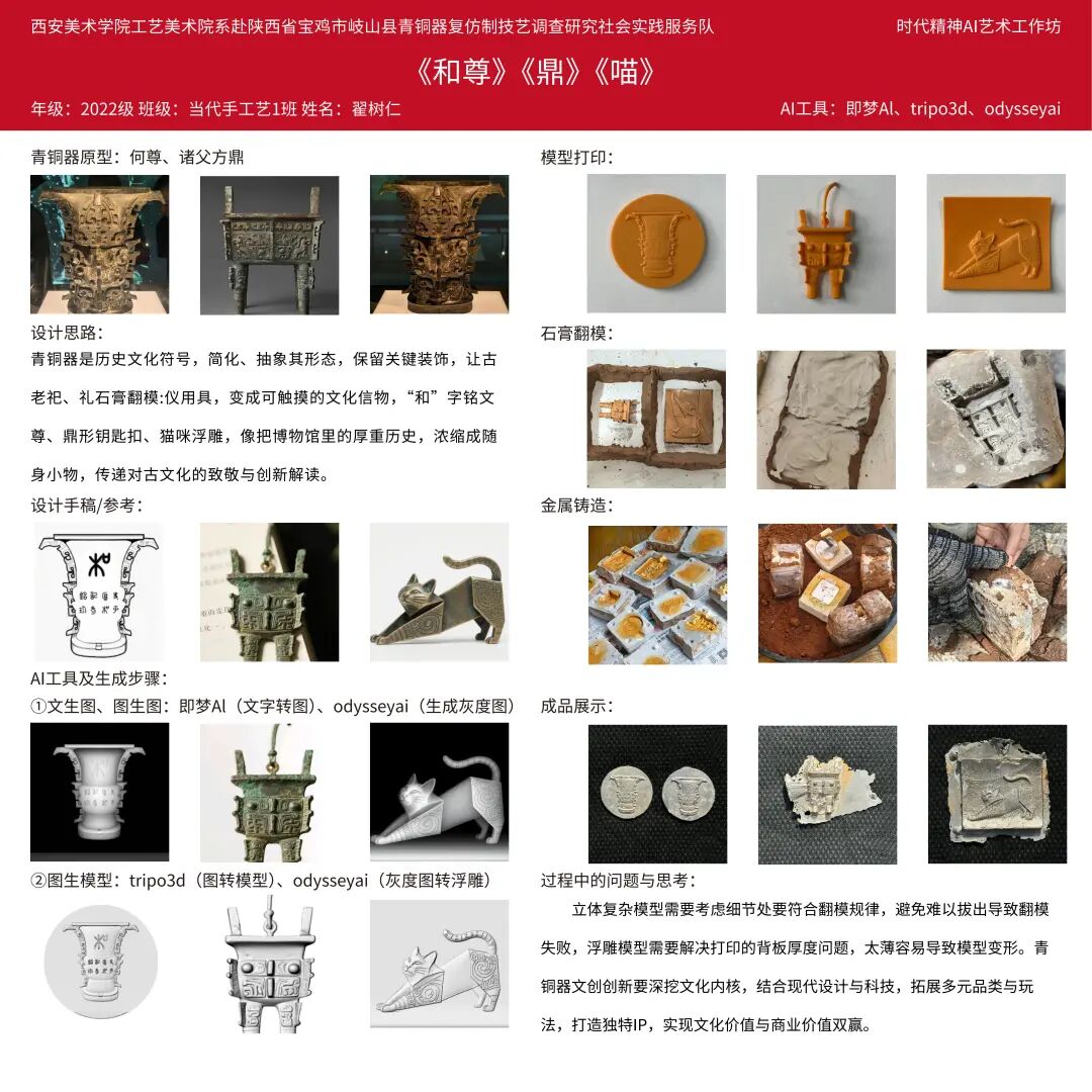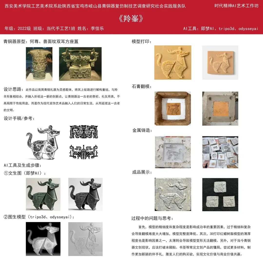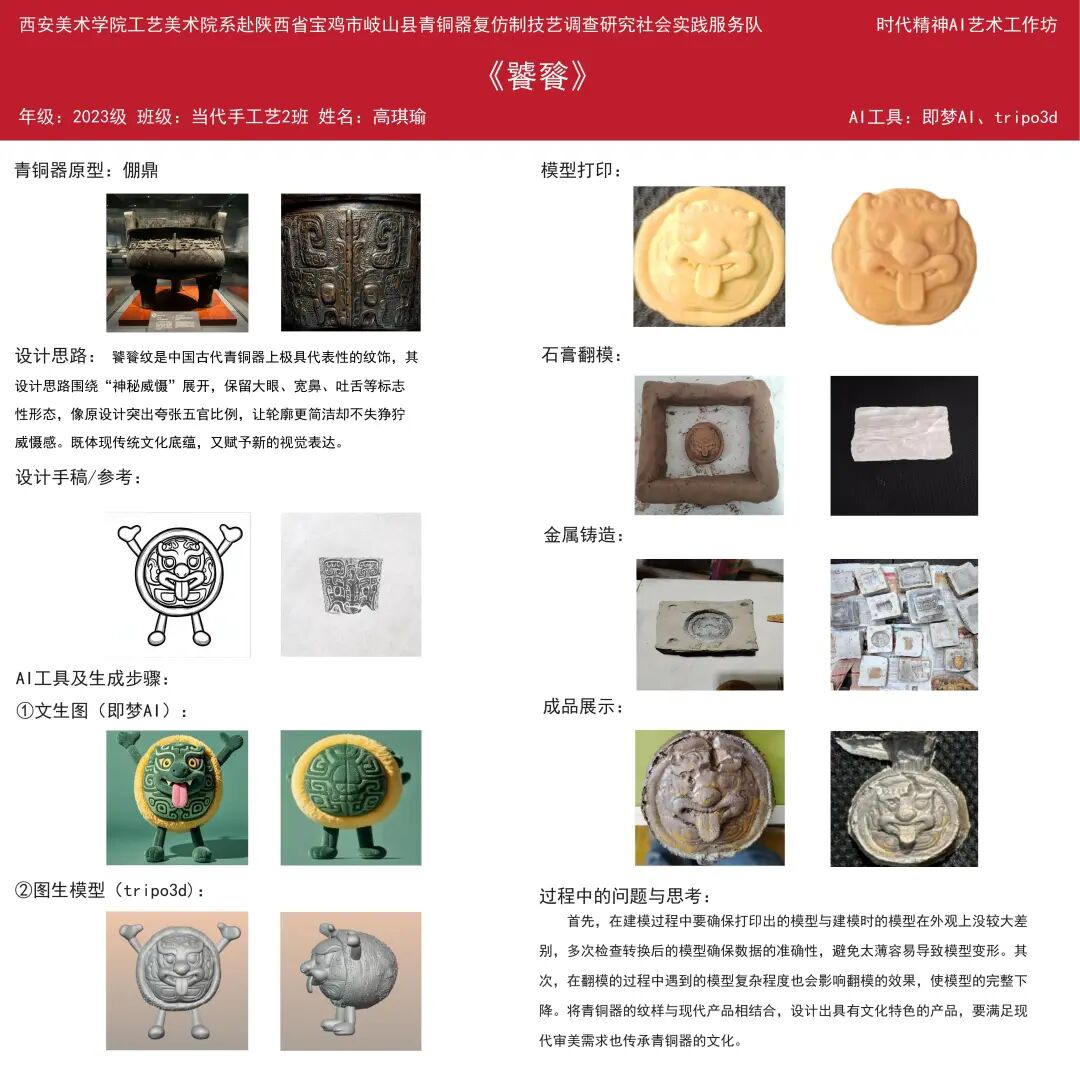 此次社会实践深切感受到了同学们在青铜器文创设计中的专注与成长。本次共完成6件AI赋能的青铜器文创作品,作品在传承周原文化纹样语言与青铜工艺美学的基础上,巧妙融入现代设计理念与数字建模技术,既保留了传统形制的庄重典雅,又体现出青年创作者鲜明的时代表达与个性审美,初步展现了“非遗+科技+文创”融合发展的实践潜力。希望同学们以此次调研与创作为起点,持续深入历史、扎根文化土壤,在未来的专业学习与艺术创作中不断探索、不断突破,创作出更多有温度、有厚度、有影响力的优秀作品。