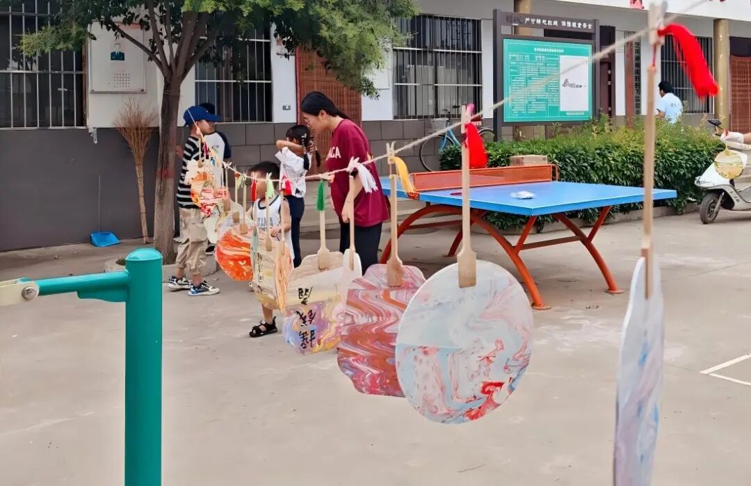 交付现场,村民驻足参观,热切交流。一位80多岁的老党员感慨道:“画里仿佛真能听见黄河水声!咱村的历史不能忘,娃娃们画得真好!”村委会院内,孩子们创作的“童心绘东渡”作品与漂漆扇由红绳悬挂,构成一道独特的艺术风景线。78岁的徐大爷指着孙女的画作,脸上写满自豪。临别之际,队员们将精心制作的五彩斑斓漂漆扇赠予村民,把把扇子承载着浓浓情谊。这次实践让青年大学生们对“艺术为人民服务”的初心使命、对革命精神的时代传承,有了更加深刻