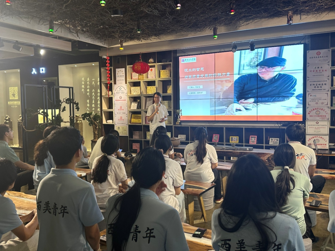 刘训立老师在博物馆内,实践转化为生动的课堂,开展了以“泥土的哲思与高质量发展的实践力量”的主题演讲。刘老师从个人成长经历和求学历程出发,讲述了他与陶艺的缘分,分享了生动案例,激发了大家的文化自信。他剖析陶瓷手工艺前景,阐释艺术创作在乡村高质量发展中的核心作用,并展示所带学生优秀作品。其简洁风趣的语言不仅点燃了队员的专业自豪感与学术热情,更以“人塑泥,泥塑我”的深刻哲思,揭示了艺术根性的实践力量,为乡村振兴注入了新视角。