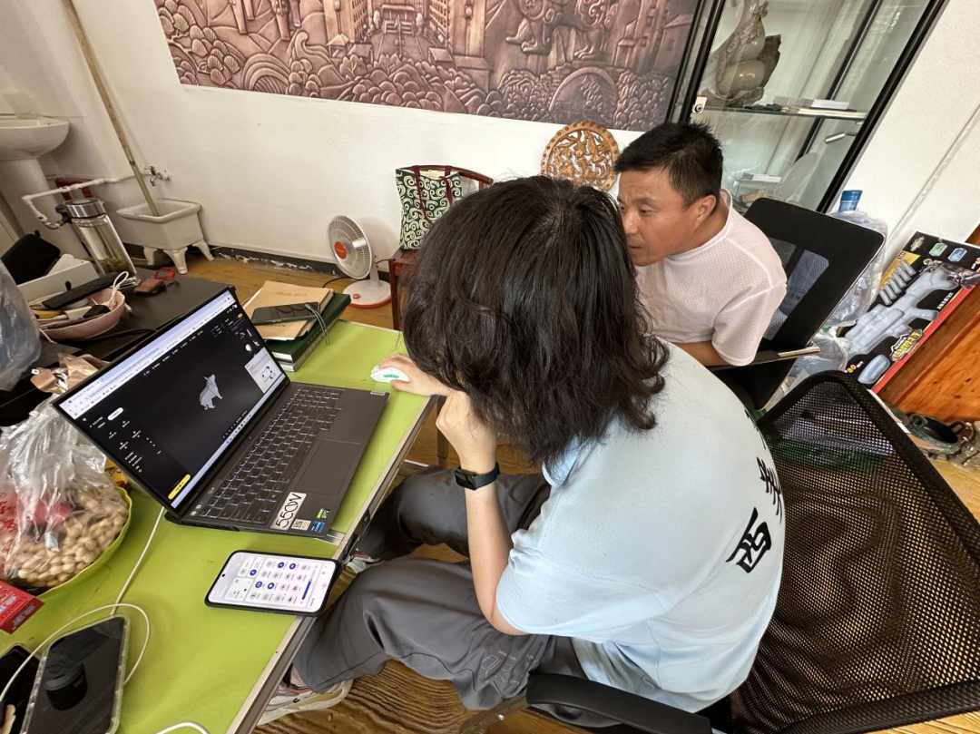 在紧张的技艺操作之余,同学们也积极展开交流与分享。以翟树仁同学为代表,向于总简要介绍了AI辅助设计在文创开发中的应用路径,演示了如何借助Tripo 3D、腾讯混元、奥德赛等工具,在传统青铜器造型与纹饰的基础上生成新的创意表达。