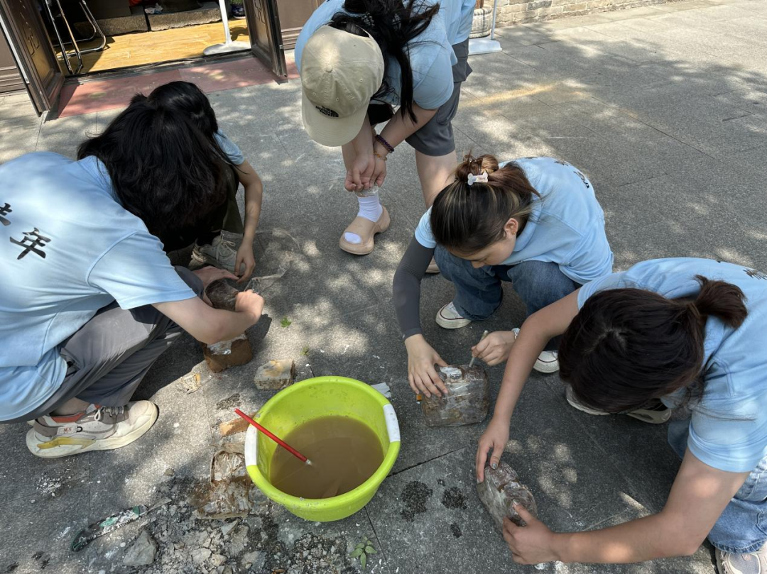 7月9日,是此次社会实践服务队的最后一天行程。清晨,同学们早早整装,赶往岐山县太平寺塔下的传统金工传习所,准备开始期待已久的金属铸造环节。而于安君先生比大家更早一步,已将各组的石膏模具整齐地放入烤箱进行二次烘干加固,为当天的实践工作做好充分准备。为了防止模具在高温金属浇铸时因残余水汽而产生爆裂,于总在模具内芯均匀喷涂了一层防护油漆。待所有模具充分干燥后,于总带领同学们进行模具合模操作,先将石膏阴阳模精准合拢,再用宽胶带一圈圈缠紧,随后用湿泥条层层包裹,仅在顶端留出进料的水口位置。这种“胶带+泥巴”的加固方式,是传统经验与当代材料的结合,可有效预防因浇铸时模具胀裂而导致的失败。