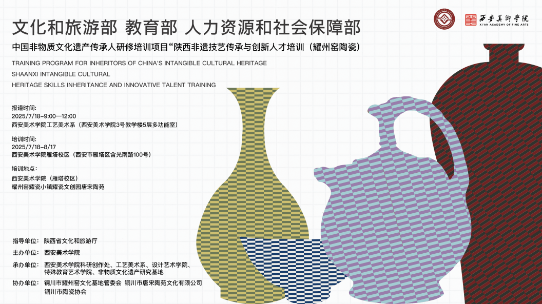 “中国非物质文化遗产传承人研修培训计划”由国家文化和旅游部、教育部、人力资源和社会保障部共同实施,旨在为非遗传承人提供高校学术与教学资源支持,通过系统性研修提升传承人技艺创新与活化能力,推动传统工艺振兴。根据《中国非物质文化遗产传承人研修培训计划实施方案(2021—2025)》,在陕西省文化和旅游厅指导支持下,西安美术学院成功申报并获批,“2025年度中国非物质文化遗产传承人研修培训计划”——“陕西非遗技艺传承与创新人才培训(耀州窑陶瓷)”。
