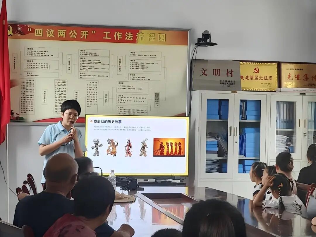 紧接着的非遗文化讲堂,更是让大家领略到了陕西非遗的独特魅力。高岩老师简单介绍了凤翔泥塑、西秦刺绣、华县皮影、安塞剪纸、汉中藤编、耀州窑等众多陕西非遗项目。她讲述了凤翔泥塑色彩鲜艳、造型夸张的特点,以及背后蕴含的民间故事;描述了西秦刺绣在日常生活中的应用,那一针一线都凝聚着劳动人民的智慧;还提及了华县皮影在光影变幻中演绎的精彩故事。这些来自陕西各地的非遗项目,如同璀璨的星河,让村民和孩子们深深感受到了传统文化的博大精深。