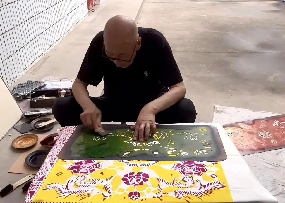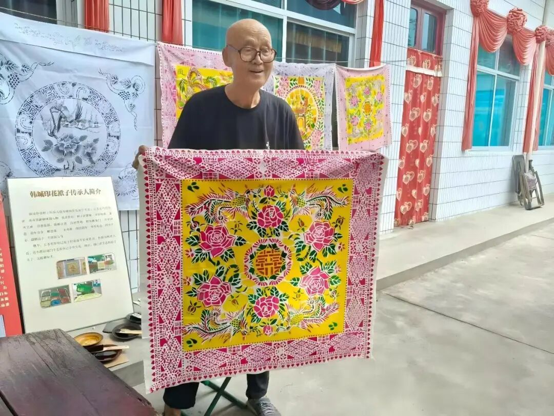 下午我们来到了韩城印花技艺代表性传承人徐万怀老人的家中,院子里晾晒的彩色印花布在风中轻摆,像一片流动的云。年过七旬的徐老先生正坐在竹椅上整理染料,见队员们来访,立刻起身展示他的“宝贝”——一沓沓保存完好的印花袱子,图案有缠枝莲、吉祥纹,还有融入韩城地名的独特设计。“我跟这门手艺打交道,算起来有五十多年了。”徐老先生摩挲着一块刚印好的布,回忆起学艺的缘起,“小时候看我父亲和爷爷印包袱布,觉得那染出的颜色比花还好看,就跟着他学调浆、刻板、染色。”