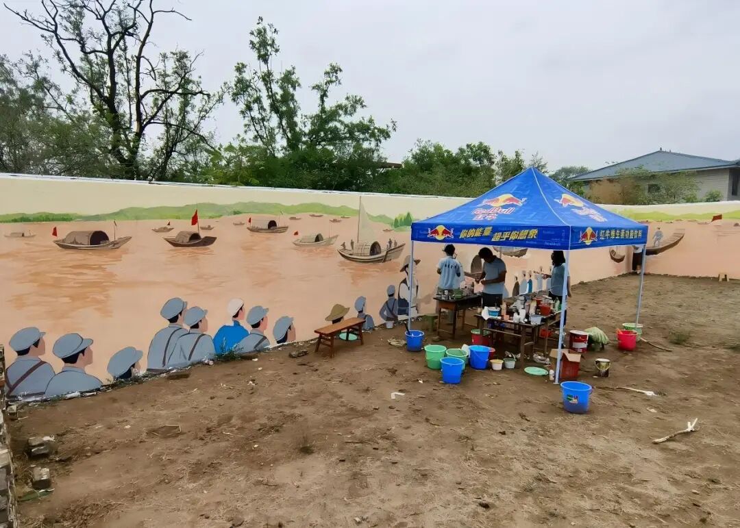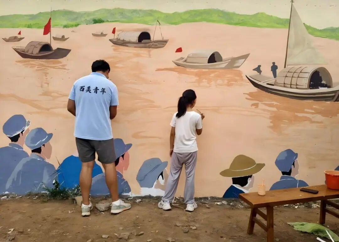 绘制东渡场景的队员们在20多米长的墙面精心绘制,用细腻的笔触重现历史:宽阔的河面波光粼粼,木船平稳前行,八路军战士们神情坚毅地伫立船头,村民们或撑船或递水或送别,男女老少齐心协力,军民鱼水情深的画面跃然墙上。每一笔都饱含着对革命先辈的崇敬,每一色都传递着红色精神的传承。