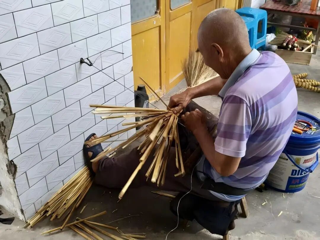 离开徐老先生家,队员们又来到村南头扎扫帚的老院。72岁的徐三勤大爷正坐在院里的石墙边,手里的高粱秆在铁丝的缠绕下渐渐成型,随后加上泡过的红色高粱秆皮,是韩城红把扫帚的标志。徐大爷的手指粗糙却灵活,捆扎的力道均匀得像用尺子量过,“红把有讲究,红色是‘红火’,高粱秆是‘节节高’,结婚时扫新房,是盼着日子干净兴旺;老人过世时用,是祈愿一路走好。”徐大爷拿起一把刚扎好的扫帚示范道:“看这力道,得扎得紧实,用上三五年都不带松的。”院墙边整齐地码放着几十把扎好的扫帚,在阳光下泛着温暖的红光,仿佛在诉说着这门老手艺的岁月故事。