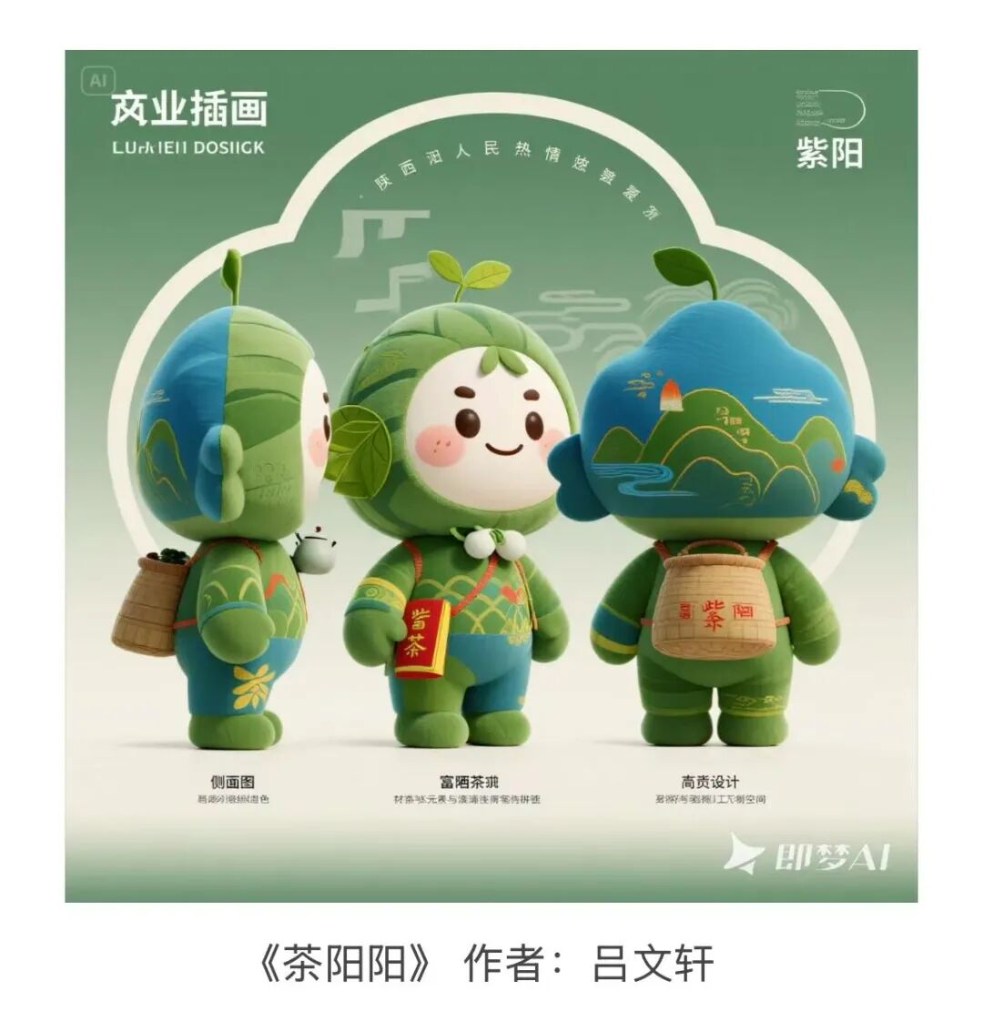 结合两天实地调研,同学们发挥专业优势,积极运用AI数字工具创作了系列创新设计方案,将紫阳民歌、文笔山,美食,富硒茶等元素转化为毛绒玩具形象,为紫阳县设计具有地域特色的包装和品牌故事。我们不仅要学习工人们的工匠精神,更要用专业眼光发现产业升级的可能性,为推动艺术助力紫阳县域高质量发展贡献力量。团队共计产出作品20余件,方案可行性高,部分设计将继续推进后续制作环节。