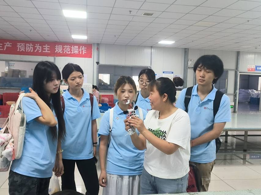 在爱多宝公司的生产车间,实践队员分组深入不同工序,亲身体验毛绒玩偶从设计图稿到立体成品的制造全过程。