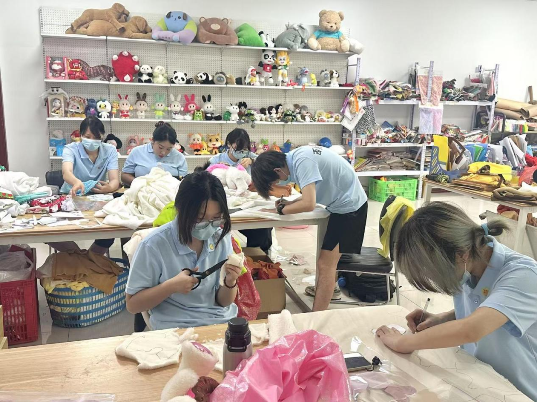 操作中,队员们遭遇布料“较劲”、玩偶变“圆气球”等状况,在师傅指导和互助下,逐渐领悟简单玩偶背后所需的“稳、准、恰到好处”。据最终统计共翻包270余个,充棉三件,缝针收尾192个。车间里,不同年龄段的工人各司其职,以专注态度确保每件玩偶品质。