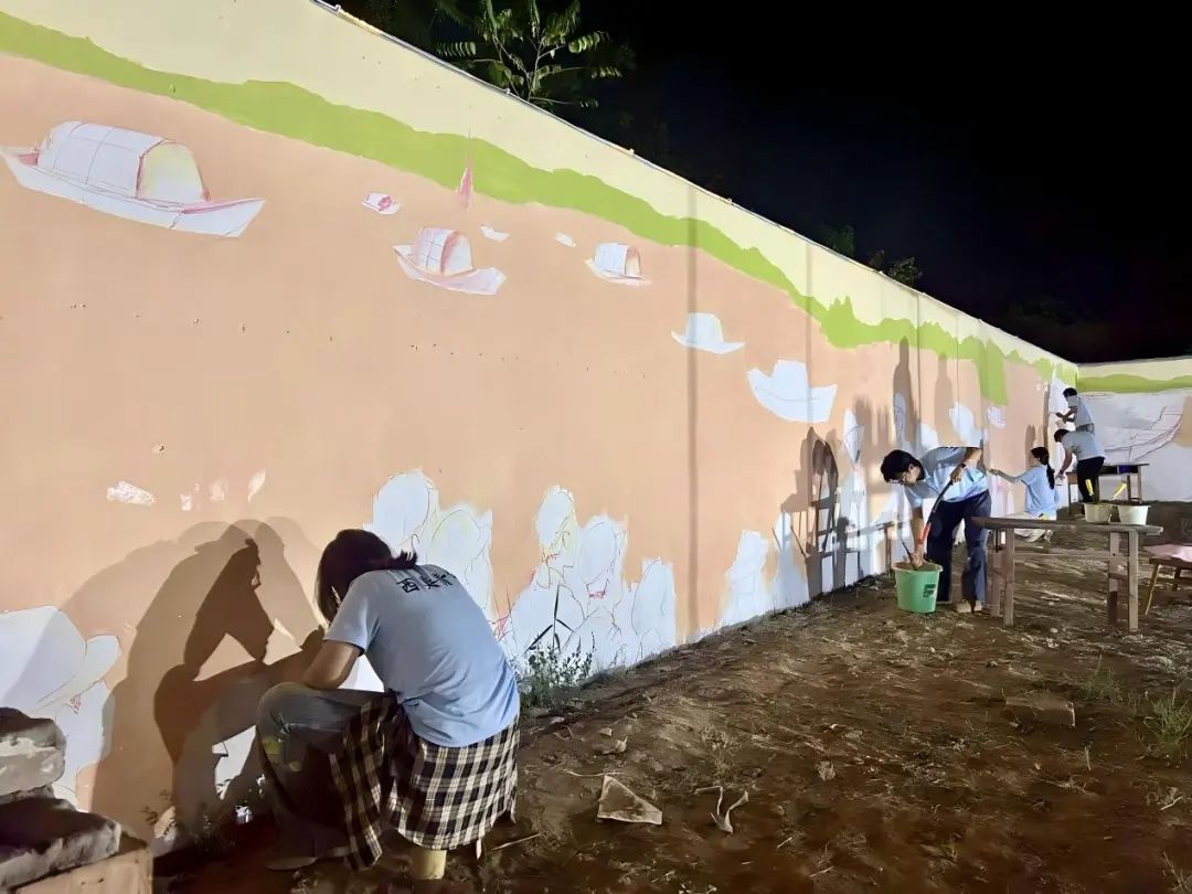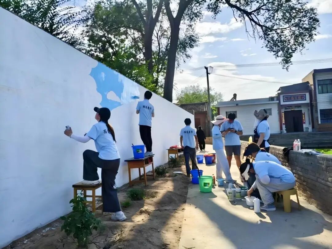 与此同时,另一组队员在党群服务中心对面墙上进行乡村振兴主题作品的底色绘制。组长陈怡佳希带领队员们用大号画笔铺展麦田的金黄、农机的银白等主色调,初步构建出丰收场景的框架。路过的村民不时驻足观看,对逐渐成型的画面充满期待。