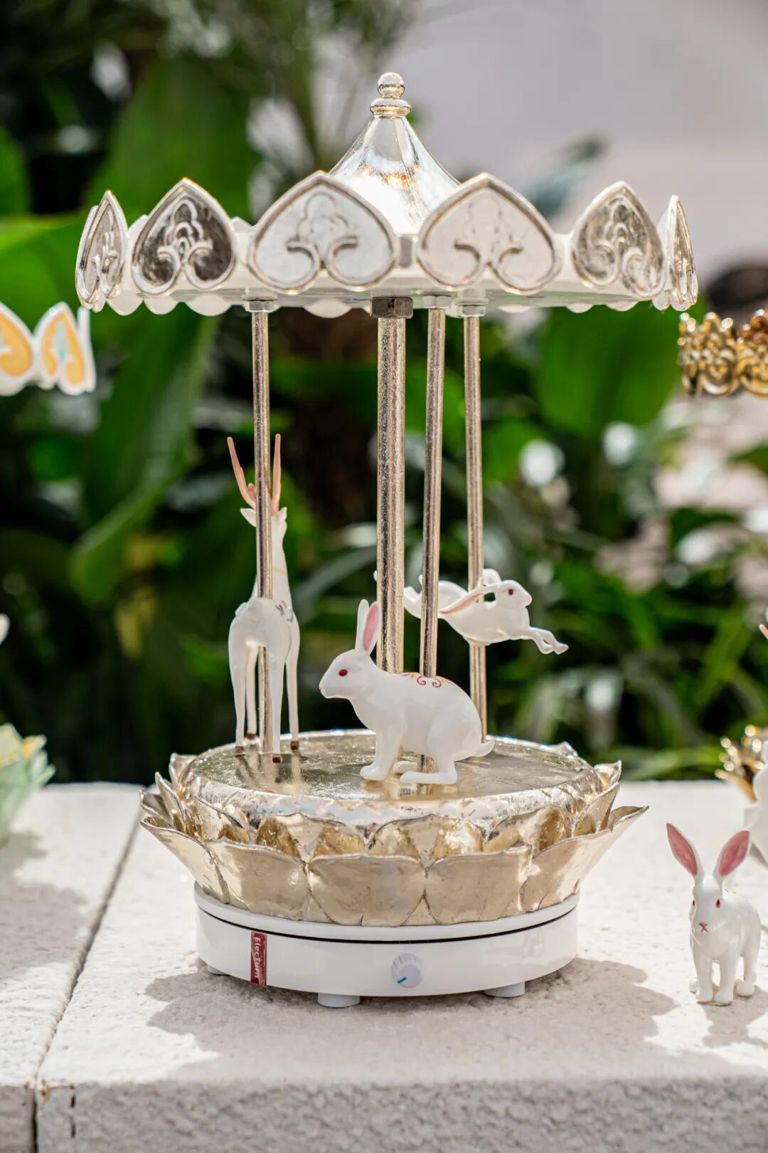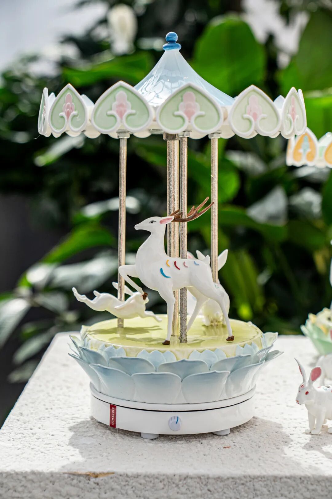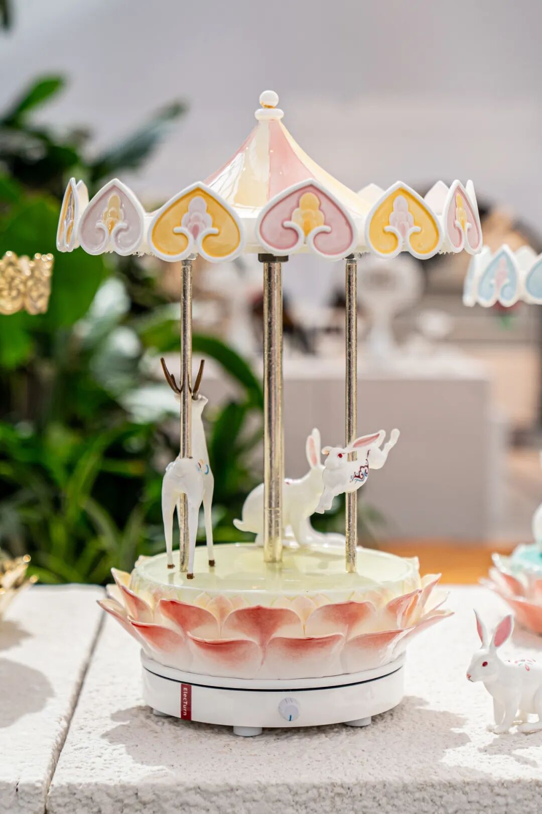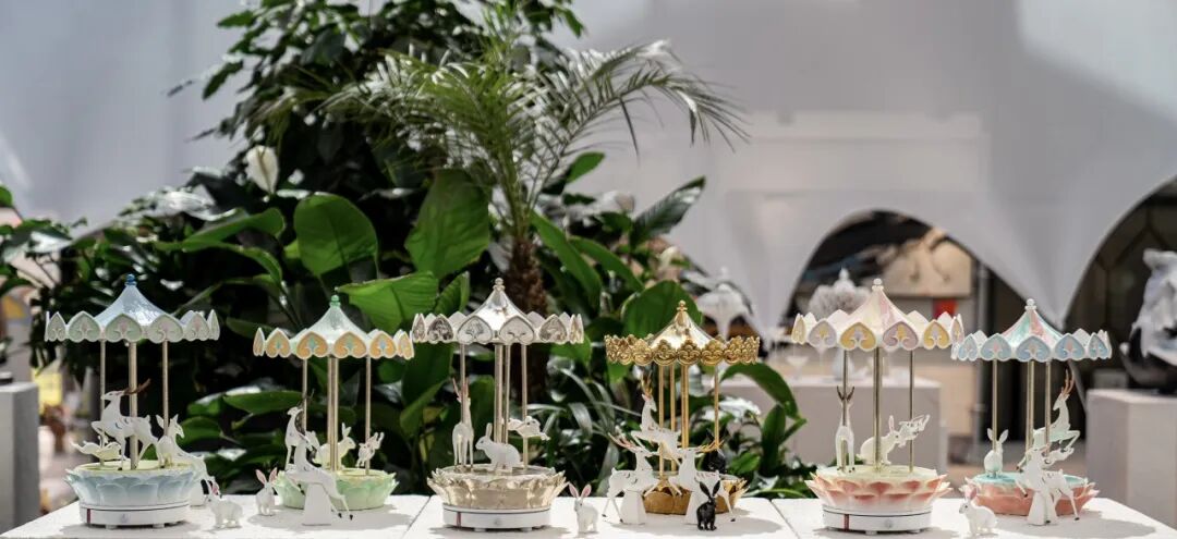 作品阐述:作品将传统旋转木马的形态进行艺术化处理,以陶瓷独特的质感与可塑性,将其打造成充满东方韵味的旋转舞台。当旋转木马缓缓转动,九色鹿、兔子与莲花台随之流转,光影在釉面折射,仿佛将观者带入敦煌壁画的神秘世界,又似踏入梦幻童话之境。陶瓷材质的运用,不仅保留了敦煌文化的厚重历史感,更通过精湛的制瓷工艺,展现出细腻温润的质地与独特的艺术魅力,实现传统文化元素与现代艺术形式的完美融合,传递出对传统文化的传承与创新,以及对美好生活的向往与追求 。
