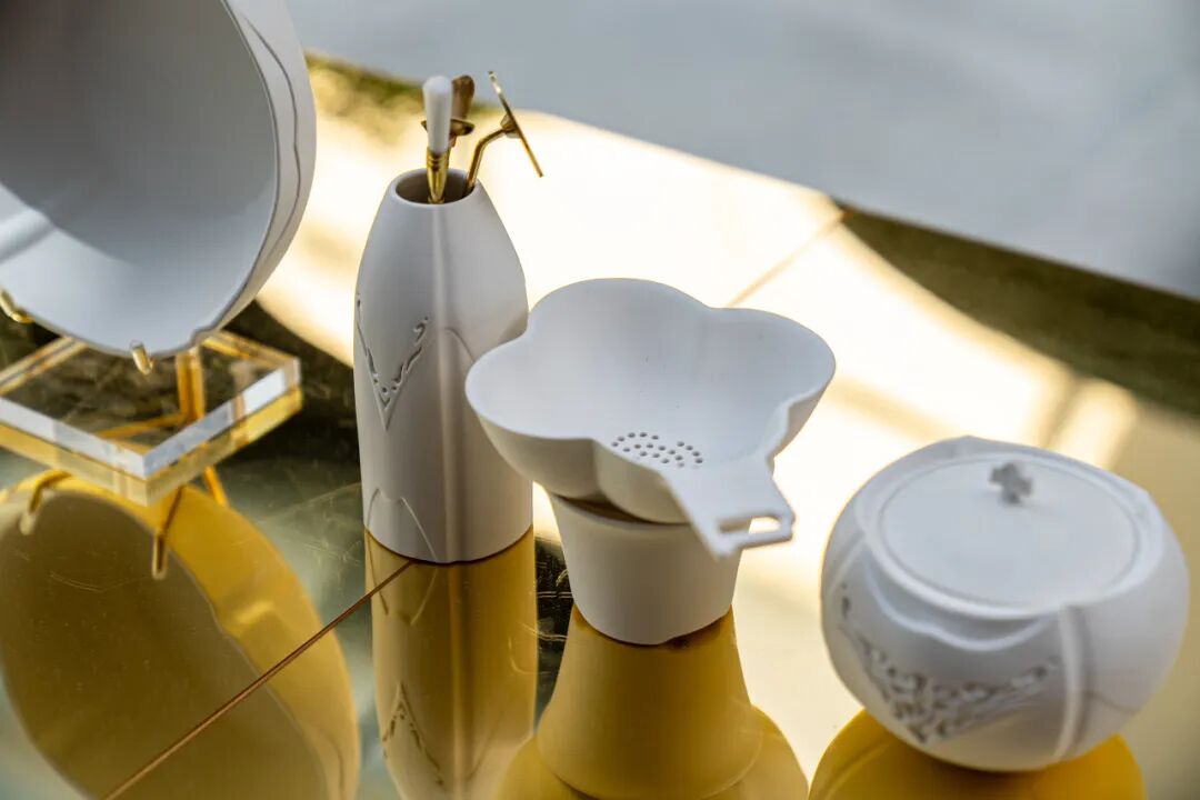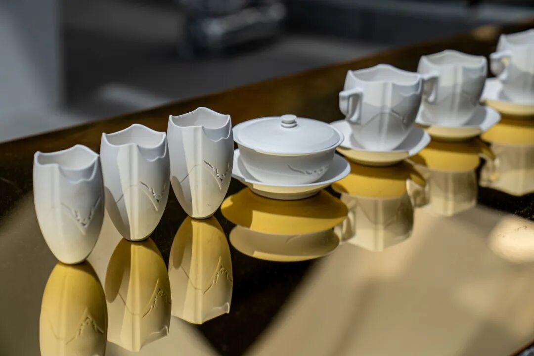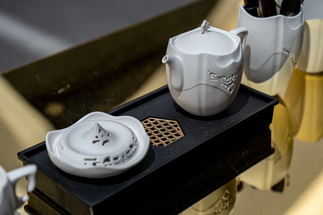 作品阐述:以青铜器饕餮纹为核心元素,根据当代审美对传统纹样进行了新的演绎,将古老纹样饕餮纹与女书字形的柔婉韵致转化为兼具艺术感与现代审美的装饰语言,实现传统文化的创新性转换。材质上,玲珑釉的运用使纹样在光影交错中呈现出丰富的层次,宛如青铜器纹饰在时光中淬炼后的涅槃重生,赋予器物雅致而深邃的美学内涵。其中,双耳杯的设计独具匠心,对称的耳柄不仅在形态上彰显平衡之美,双手持耳的姿态更在使用场景中构建起礼节性仪式,既是对传统礼仪的诗意传承,又在当代生活场景中营造出饮茶的仪式感,让每一次触碰都成为文化与情感的交融。整套作品以现代设计语言重塑古典符号,在材质创新、纹样解构与功能美学的多维碰撞中,达成传统文化与现代生活的深度对话,既承载着历史的厚重底蕴,又以优雅之姿诠释当代审美,为日常器物注入文化灵魂,成为连接过去与未来的艺术媒介。
