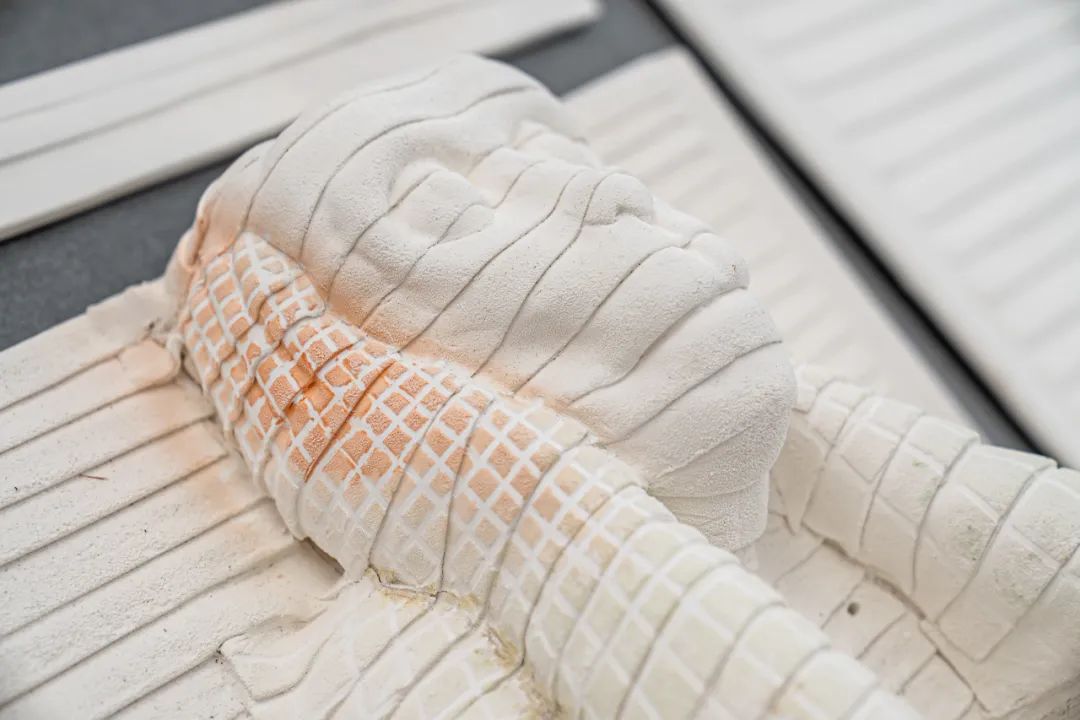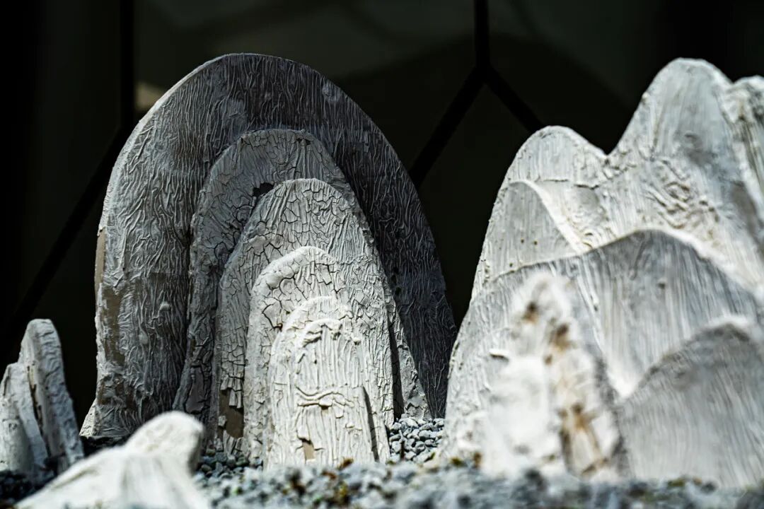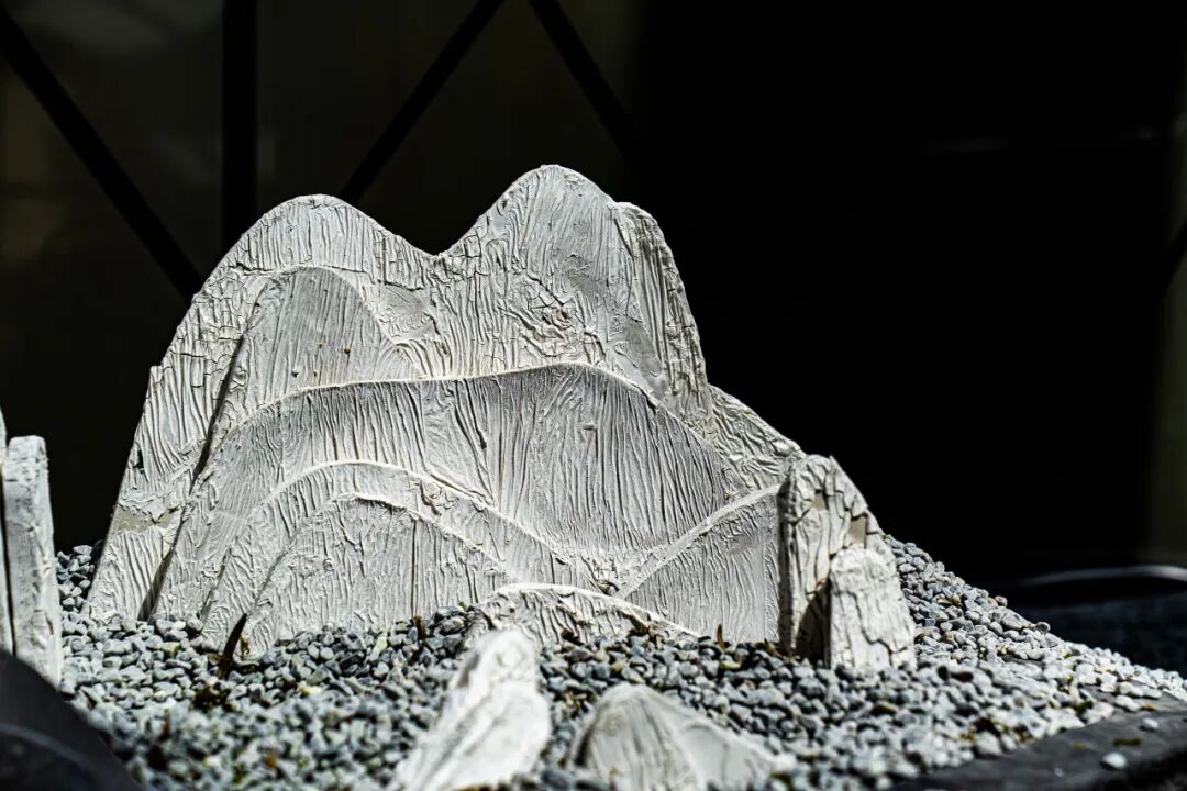 作品阐述:作品以普通山水画的皴法为灵感,采用粗陶与瓷泥泥片成型立体山坯。通过纸张与泥浆的自然吻合的纹路呈现层峦叠嶂的肌理。山体表面保留原始质感,轻微调整纸拉扯的方向形成刀刻斧劈的纹理。作品突破平面构图局限,通过环视设计,使观者在移步换景中感受"山色空蒙雨亦奇"的东方美学。泥片彼此之间特意保留了一些并未完全结合的空隙,隐喻墨字在宣纸上的“飞白”,将陶土的拙朴与山水意境相融,在刚劲与柔美间寻求平衡,诠释"天人合一"的造物理念。
