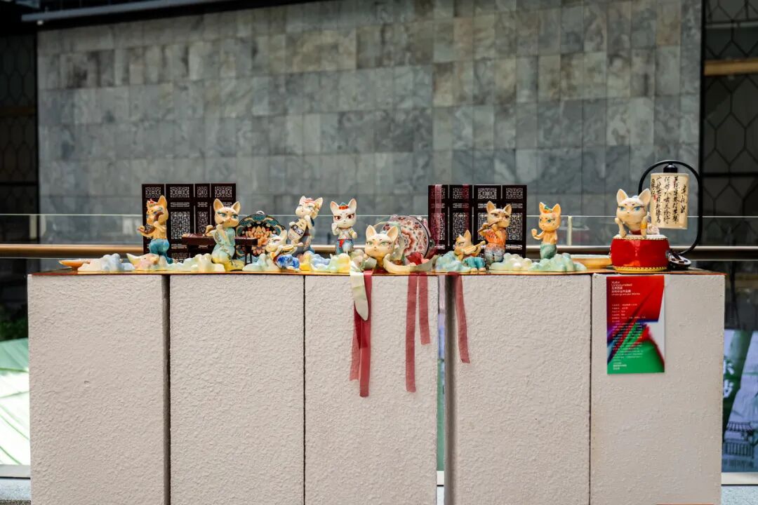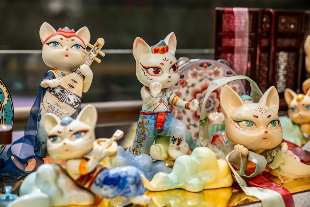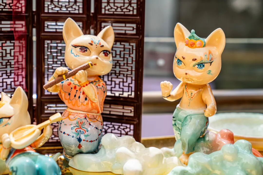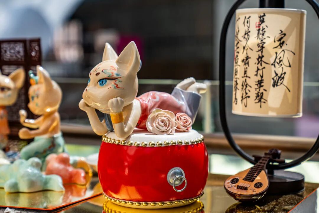 作品阐述:本作品以盛唐美学为灵感,将传统飞天形象与萌趣猫元素创新融合,打造兼具文化底蕴与潮流审美的艺术手办。主体造型为一只拟人化的唐风猫娘,身披敦煌式飘带,裙裾缀以宝相花纹,釉色选用唐三彩经典的钴蓝、琉璃黄与珊瑚红,通过高温窑变呈现渐变光泽。细节上,猫头佩戴经典头饰足踏祥云底座,手持乐器,面部采用新罗三花俑的含笑表情,传递盛唐乐舞的欢愉气息。作品以陶瓷材质体现东方温润质感,通过Q版比例平衡古典与时尚,既适合家居陈列亦具把玩趣味,让传统文化以年轻化方式焕发新生。
