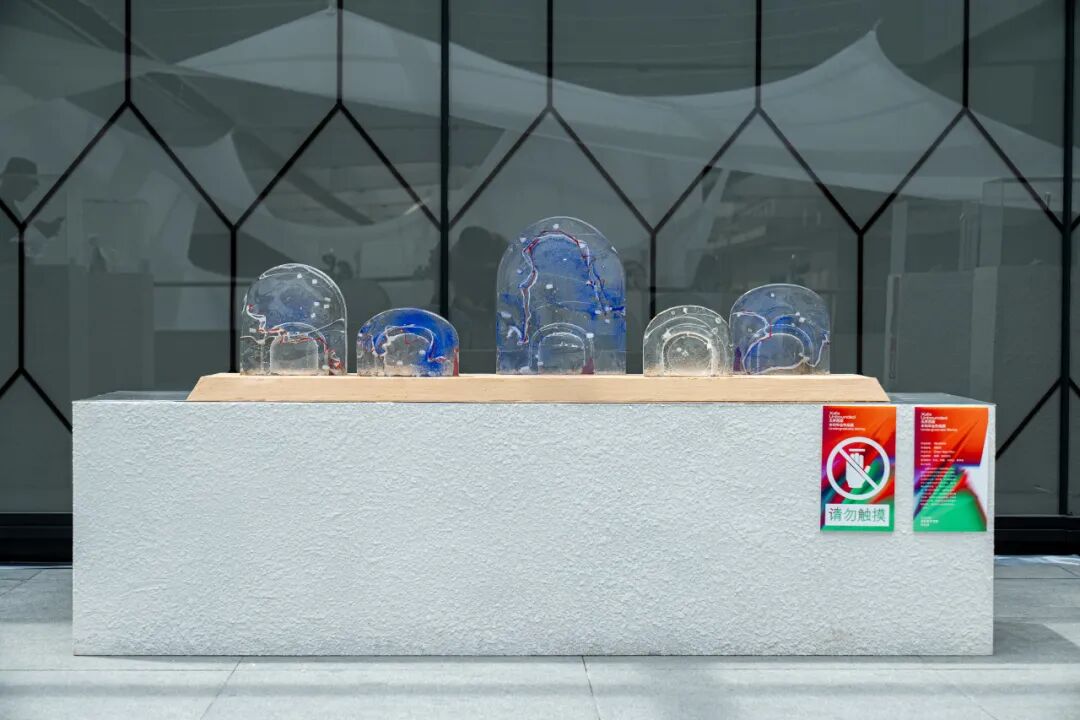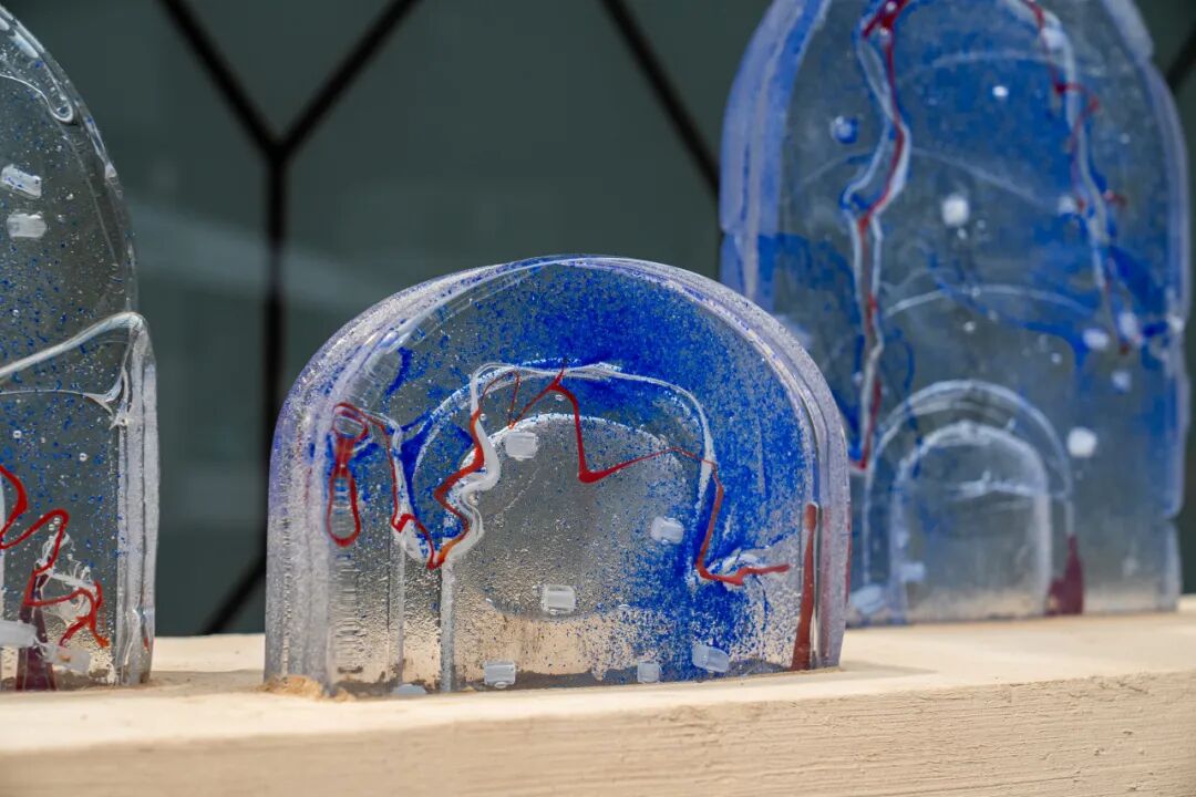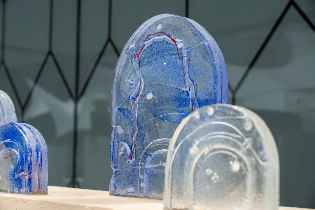 作品阐述:这组作品采用了玻璃浇铸的技法,将北方传统窑洞形制进行抽象化演绎,玻璃材质的冷冽与窑洞的粗犷形成对比,在光影中达成一种平衡。在保留窑洞作为乡土建筑的空间记忆的同时,通过玻璃的透明质感,让“窑洞的乡土记忆”与“黄河的文明脉络”呈现在光影中。在作品内部,白色与红色线条勾勒出黄河走势,红色线条如血脉奔涌,白色线条似浪花飞溅。这些线条在透明玻璃中若隐若现,宛如黄河水在窑洞空间内“流淌”。