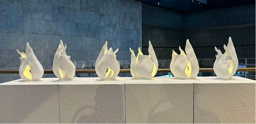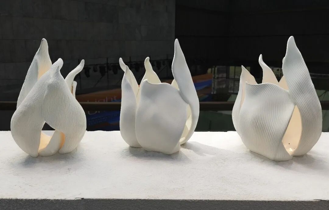 作品阐述:以温润细腻的陶瓷为载体,塑造出火焰般的造型型。作品希望能够捕捉生命呼吸的韵律,旨通过灯光明暗的交替起伏,具象化胸腔的微妙节奏,引导观者进入宁静放松的心境。灯光渐亮,如生命吸气,唤醒内在生机;灯光渐暗,似生命呼气,身心随之归于沉稳的平和。在统一的形态之下,多样的构成肌理构成了这一系列作品。细腻的磨砂纹理,宛如轻柔鼻息,透出的柔和光晕抚慰感官,营造朦胧的静谧;流畅的线条纹理,似气息自然延展,灯光在其上舒缓流淌,引人遐思;斑驳的木纹肌理,仿若呼吸的细微律动,灯光温润跃动间,传递着生命的安宁与灵动。