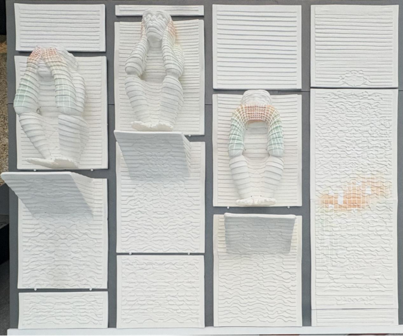 作品阐述:《符-号》探索数字时代符号作品将二进制代码(0102序列)刻印于人文载体-陶土之上,构建一种"数字图腾"——既是信息碎片,又是视觉仪式。陶土的自然肌理与机械感数字形成原始与科技的对话。采用抽象堆叠的符号造型,打破实用器皿的桎梏。表面刻意保留不同的肌理、窑火偶然性及粗粝质感。《符-号》并非提供答案,而是提出质询:当最基础的二进制语言脱离其功能语境,被铭刻于人类最古老的文明载体——陶土之上时,它是否获得了新的灵性?抑或暴露了技术符号在本质上的空洞?作品邀请观众在观察陶土的温度与凝视冰冷的数字间,寻找自己的答案。