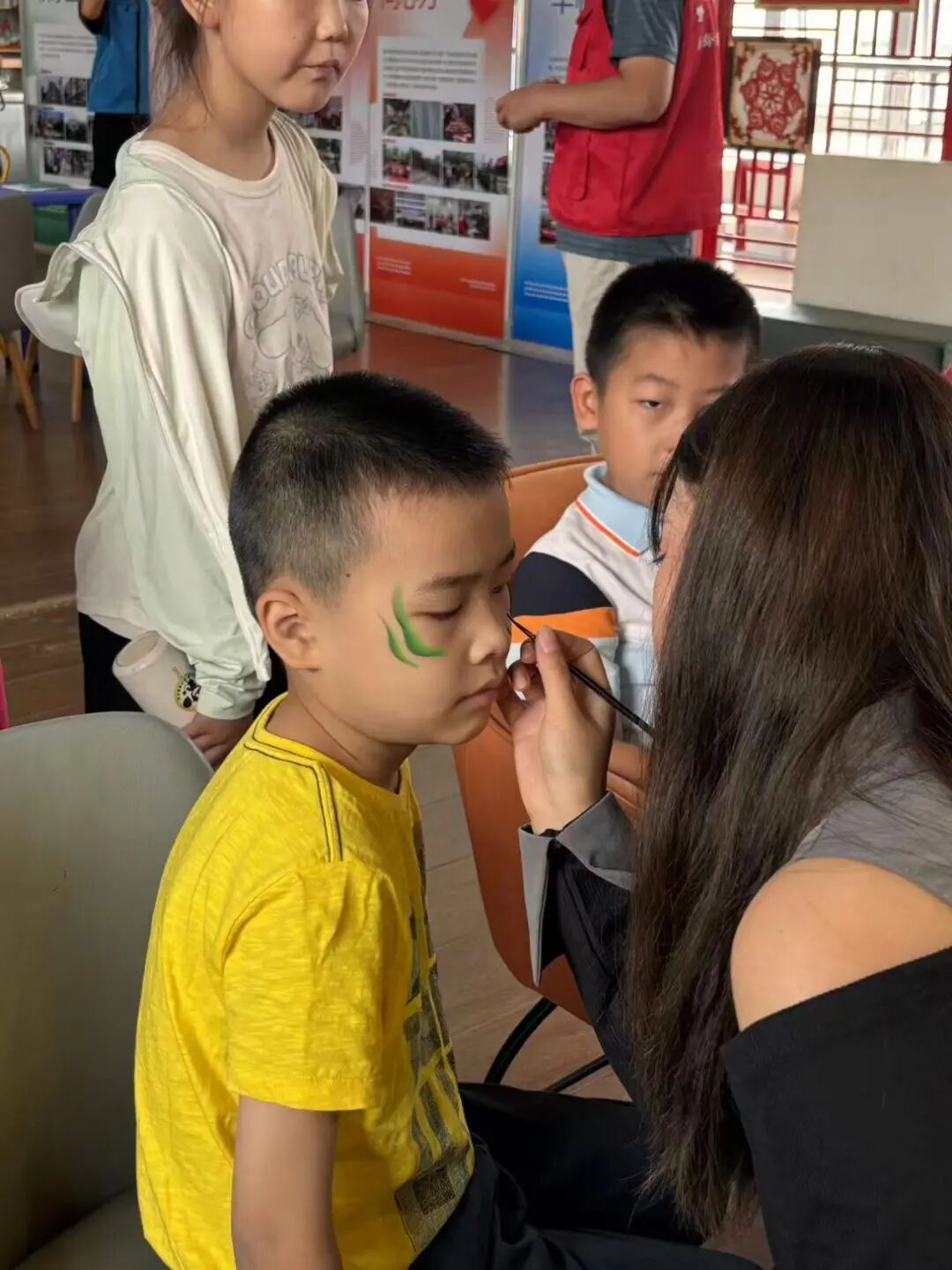 活动伊始,“童颜绘彩·非遗跃然面”环节便吸引了孩子们的目光。大家怀揣着对端午脸谱艺术的期待,早早地来到现场。我系志愿者们穿梭其中,为彩绘师们提供辅助,孩子们的笑脸化作画布,端午的粽叶艾草纹样在笔尖流淌。