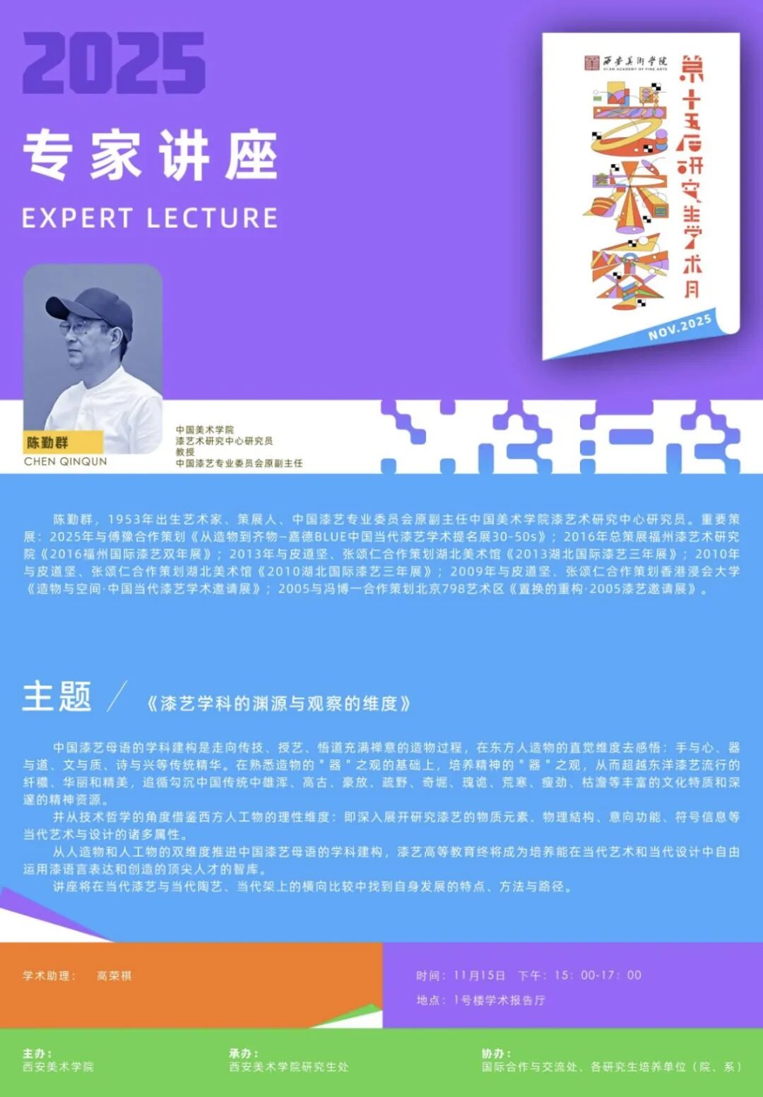 2025年11月15日下午,中国漆艺专业委员会原副主任、资深策展人陈勤群教授受西安美术学院第十五届研究生学术月的邀请,以《漆艺学科的渊源与观察的维度》为题展开深度学术讲座。本次活动由我校工艺美术系副主任刘谦教授主持,陈教授围绕漆艺的材料本体属性、学科发展谱系、中外艺术案例比较及当代创作观念四大核心议题,为师生呈现了一场兼具历史厚度与学术深度的思想盛宴。